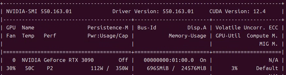 4)确保已经安装了 NVIDIA 显卡驱动: 在终端中执行:nvidia-smi 命令,如果看到类似以下界面则说明已经安装了驱动,否则请先安装最新的驱动: