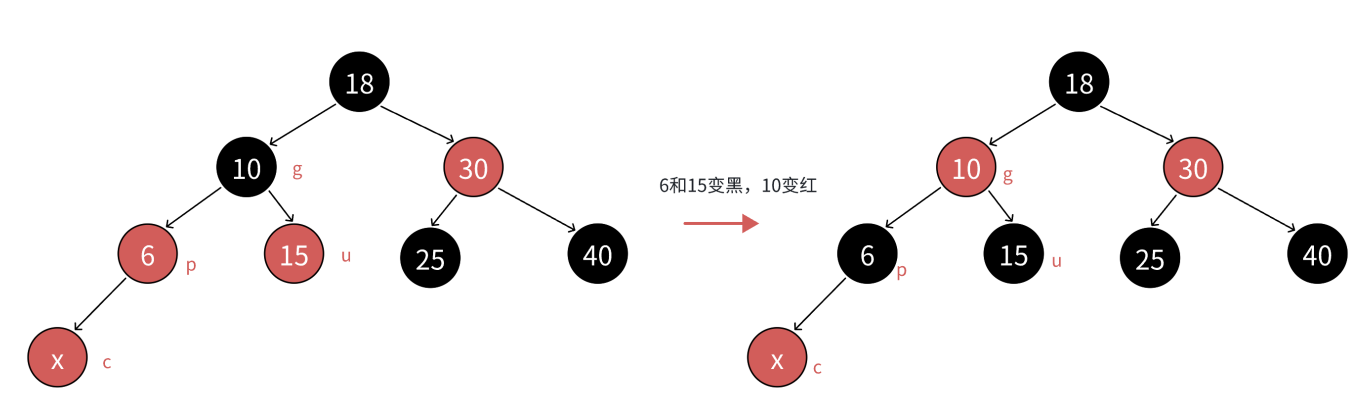 分析:因为p和u都是红色,g是黑色,把p和u变黑,左边子树路径各增加一个黑色结点,g再变红,相当于保持g所在子树的黑色结点的数量不变,同时解决了c和p连续红色结点的问题,需要继续往上更新是因为,g是红色,如果g的父亲还是红色,那么就还需要继续处理;如果g的父亲是黑色,则处理结束了;如果g就是整棵树的根,再把g变回黑色。