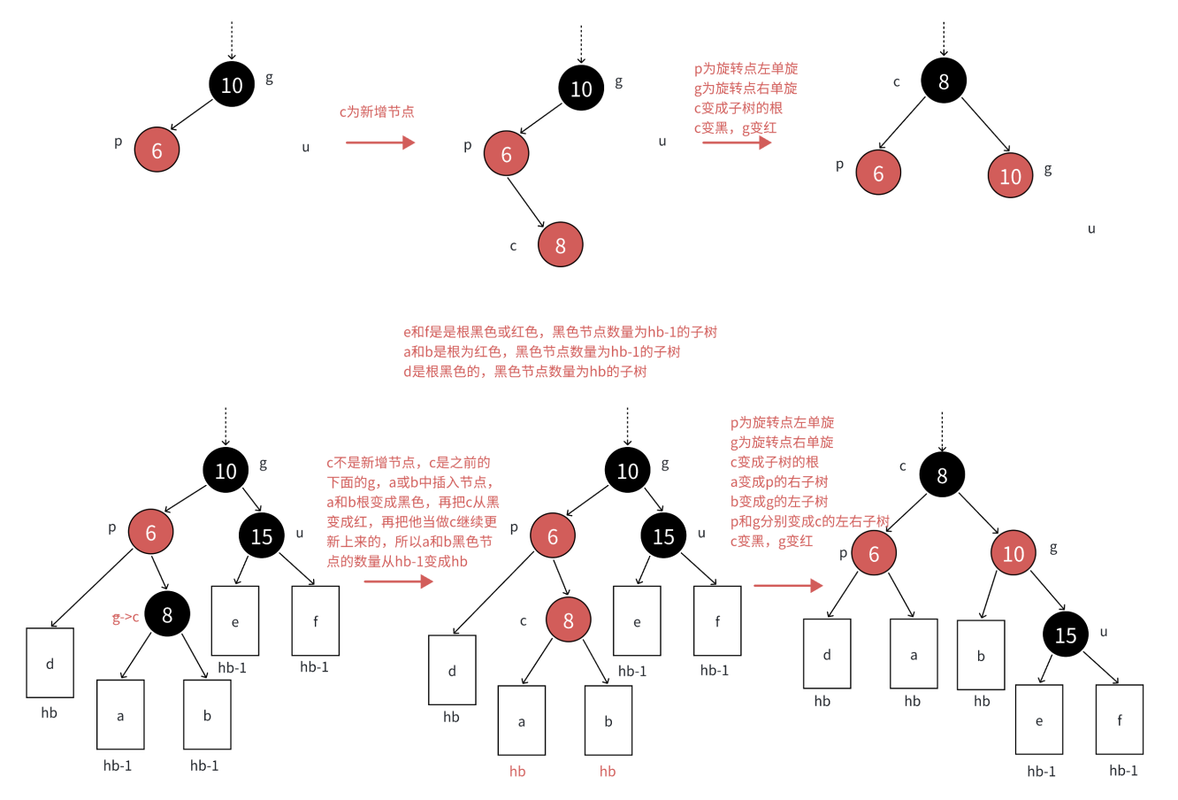 如果p是g的左子节点,c是p的右子节点,那么先以p为旋转点进行左单旋,再以g为旋转点进行右单旋,再把c变黑,g变红即可。c变成这棵树新的根,这样子树黑色结点的数量不变,没有连续的红色结点了,且不需要往上更新,因为c的父亲是黑色还是红色或者空都不违反规则。