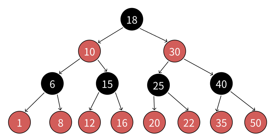由此可推:最长路径长度 ≤ 2 × 最短路径长度,保证了树的近似平衡,使得增删查改的时间复杂度稳定在 O(log N)。