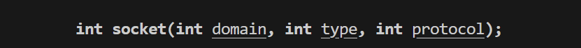 函数功能:创建一个用于网络通信的套接字(Socket),返回套接字描述符(类似文件描述符,用于后续网络操作)。