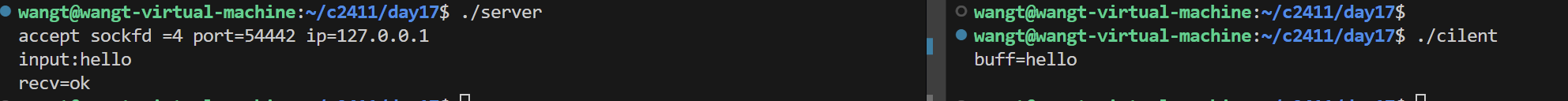 int main(){int sersockfd=socket(AF_INET,SOCK_STREAM,0);//地址族 选择socket类型TCP/UDP 协议if(sersockfd==-1){exit(1);}struct sockaddr_in saddr,caddr;//saddr存储服务器地址 caddr存储客户端地址memset(&saddr,0,sizeof(saddr));saddr.sin_family=AF_INET;saddr.sin_port=htons(6000);saddr.sin_addr.s_addr=inet_addr("127.0.0.1");int n=bind(sersockfd,(struct sockaddr*)&saddr,sizeof(saddr));if(n==-1){close(sersockfd);exit(1);}n=listen(sersockfd,5);if(n==-1){close(sersockfd);exit(1);}int len=sizeof(caddr);int cilsockfd=accept(sersockfd,(struct sockaddr*)&caddr,&len);if(cilsockfd<0){close(cilsockfd);exit(1);}printf("accept sockfd =%d port=%d ip=%s\n",cilsockfd,ntohs(caddr.sin_port),inet_ntoa(caddr.sin_addr));if(cilsockfd==0){printf("cilent close\n");close(cilsockfd);exit(1);}char buff[128]={0};printf("input:");fgets(buff,128,stdin);int byte=send(cilsockfd,buff,sizeof(buff),0);memset(buff,0,sizeof(buff));byte=recv(cilsockfd,buff,127,0);printf("recv=%s\n",buff);close(sersockfd);close(cilsockfd);exit(0);