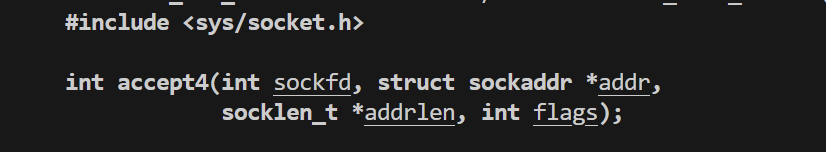 flags | 标志位,可选项如SOCK_NONBLOCK(将新套接字设为非阻塞)、SOCK_CLOEXEC(执行 exec 时关闭套接字) |