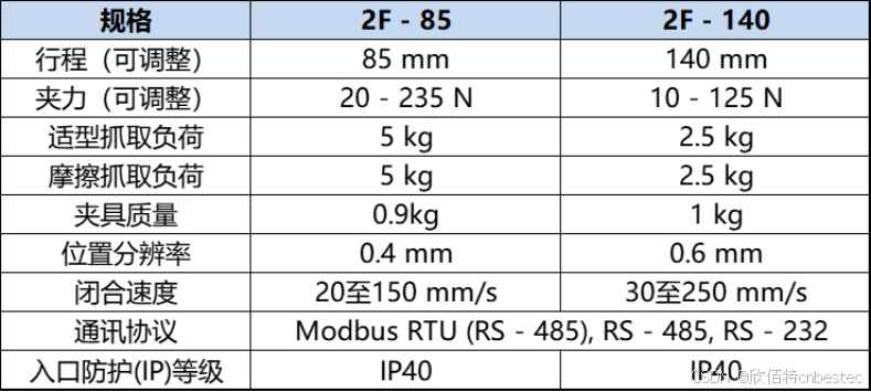 - 自适应抓取能力:2F-85提供85mm行程和20-235N可调夹力,2F-140提供140mm行程和10-125N可调夹力
