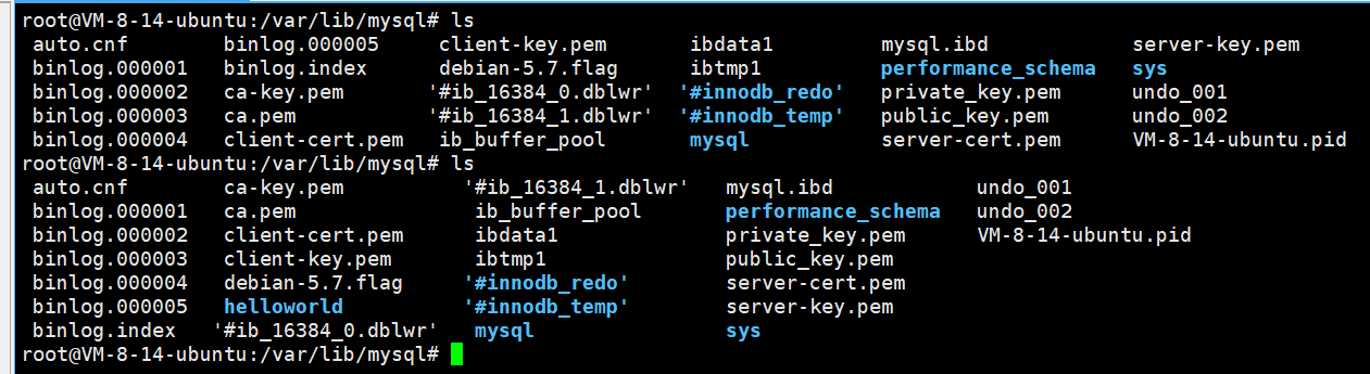 同时在另一个窗口打开/var/lib/mysql目录看一下有没有变化
