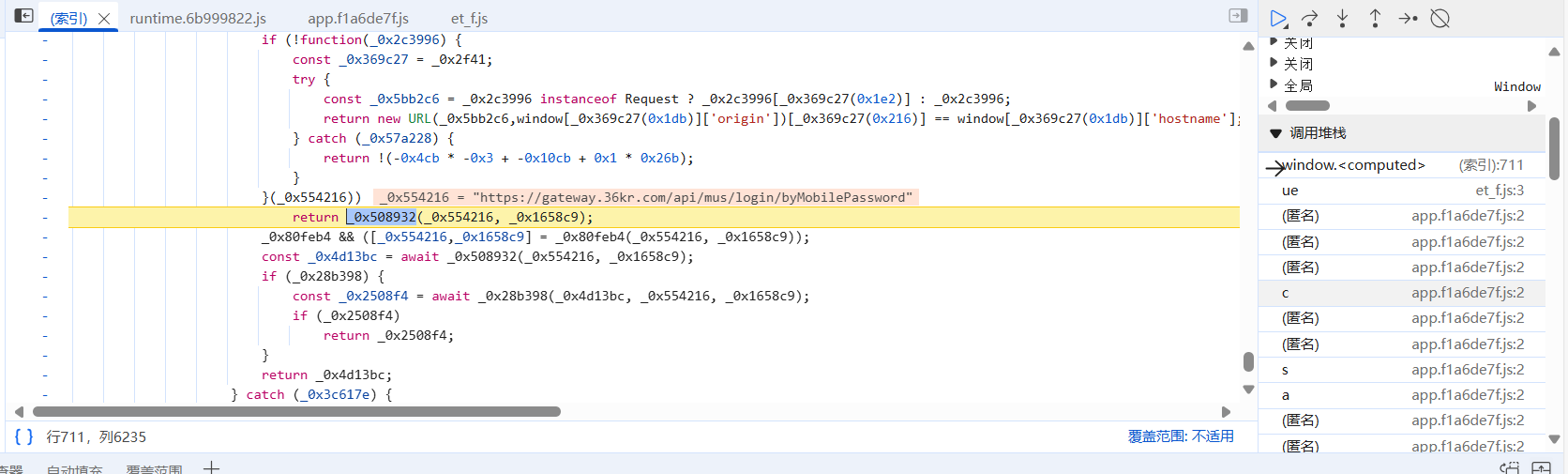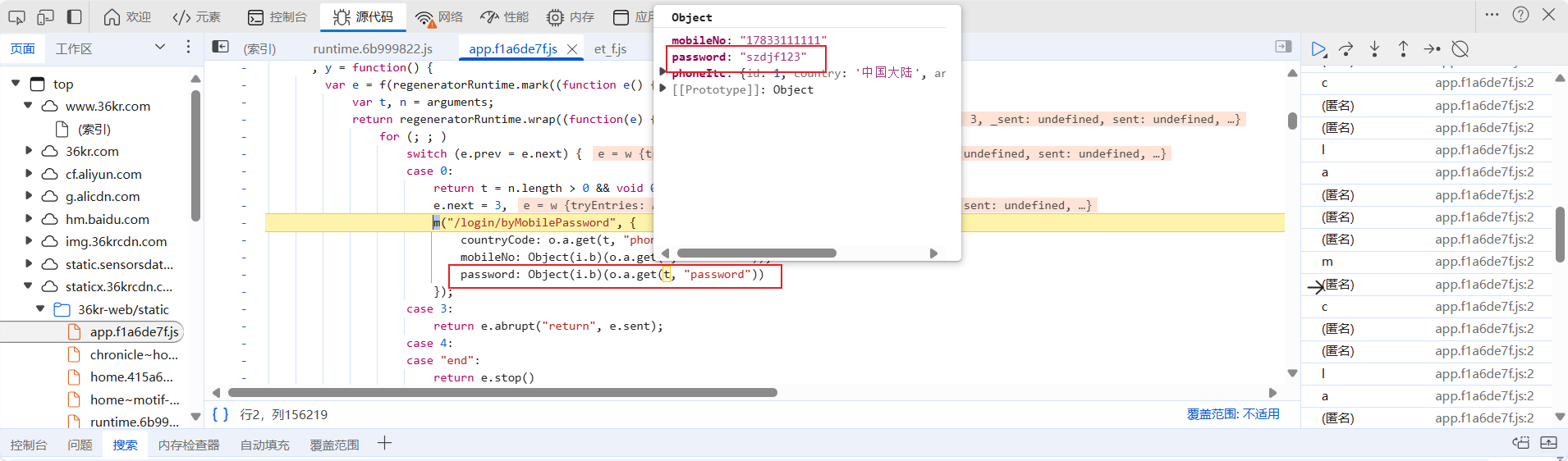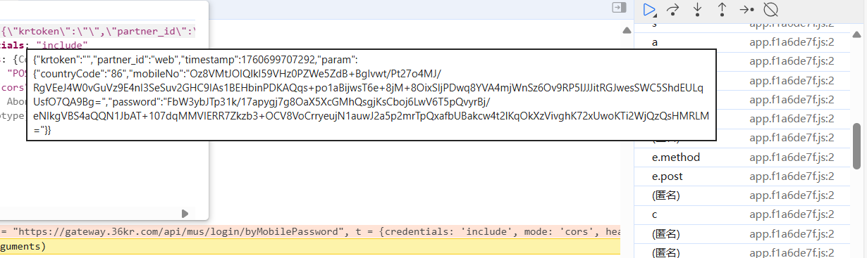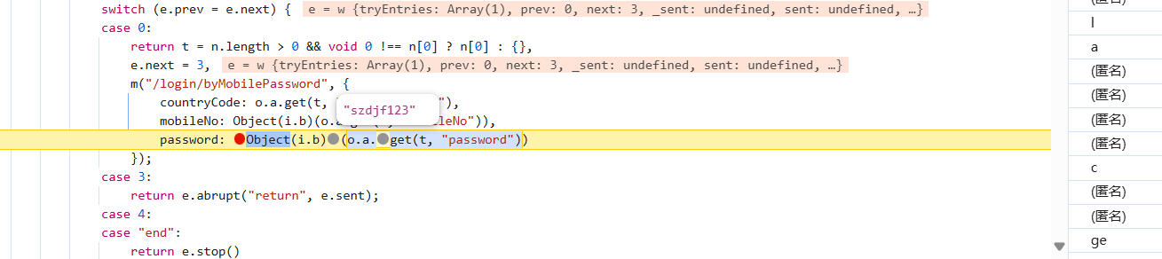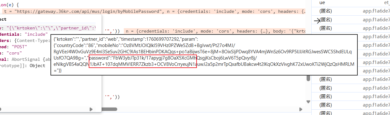 竟然藏在这个函数内部,因为这个函数有password(加密参数)赋值操作引起注意,这种一定要看一下,找到加密位置就打上断点,重新触发然后分析代码吧: