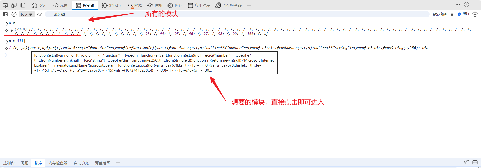 这里的n.m里面存的其实就是所有的模块,我们可以通过n.m[xxx]的的方式在控制台定位函数: