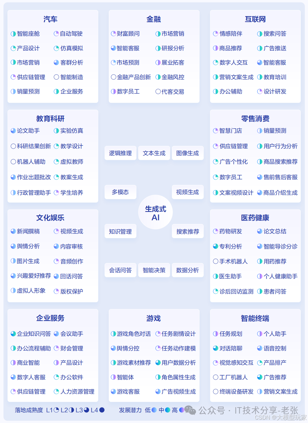 下图展示了AI大模型十个领域的落地应用场景全景图,并且把落地成熟度分为了L1-L4、发展潜力分为了低中高(见图片最下侧描述)。