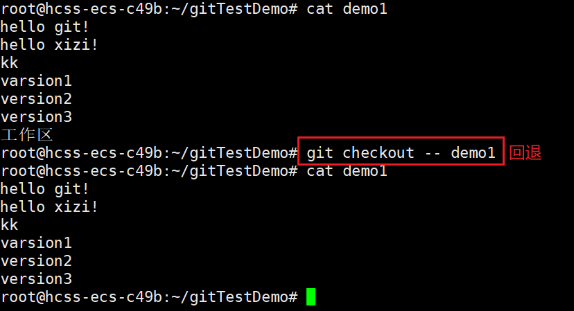 - 方法二:git checkout -- [file] 命令让⼯作区的⽂件回到最近⼀次 add 或 commit 时的状态。 要注意 git checkout -- [file] 命令中的-- 很重要,切记不要省略,⼀旦省略,该命令就变为其他意思了。