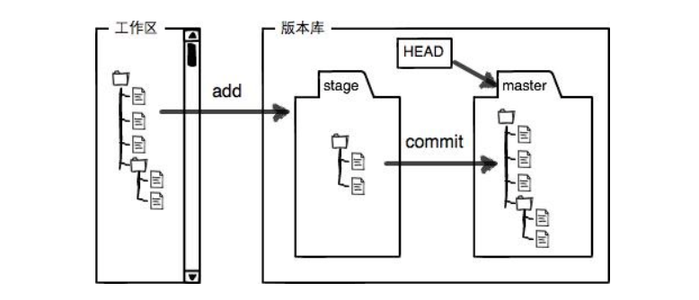 • 版本库:⼜名仓库,英⽂名 repository 。⼯作区有⼀个隐藏⽬录 .git ,它不算⼯作区,⽽是 Git的版本库。这个版本库⾥⾯的所有⽂件都可以被 Git 管理起来,每个⽂件的修改、删除,Git都能跟踪,以便任何时刻都可以追踪历史,或者在将来某个时刻可以“还原”。下⾯这个图展⽰了⼯作区、暂存区和版本库之间的关系: