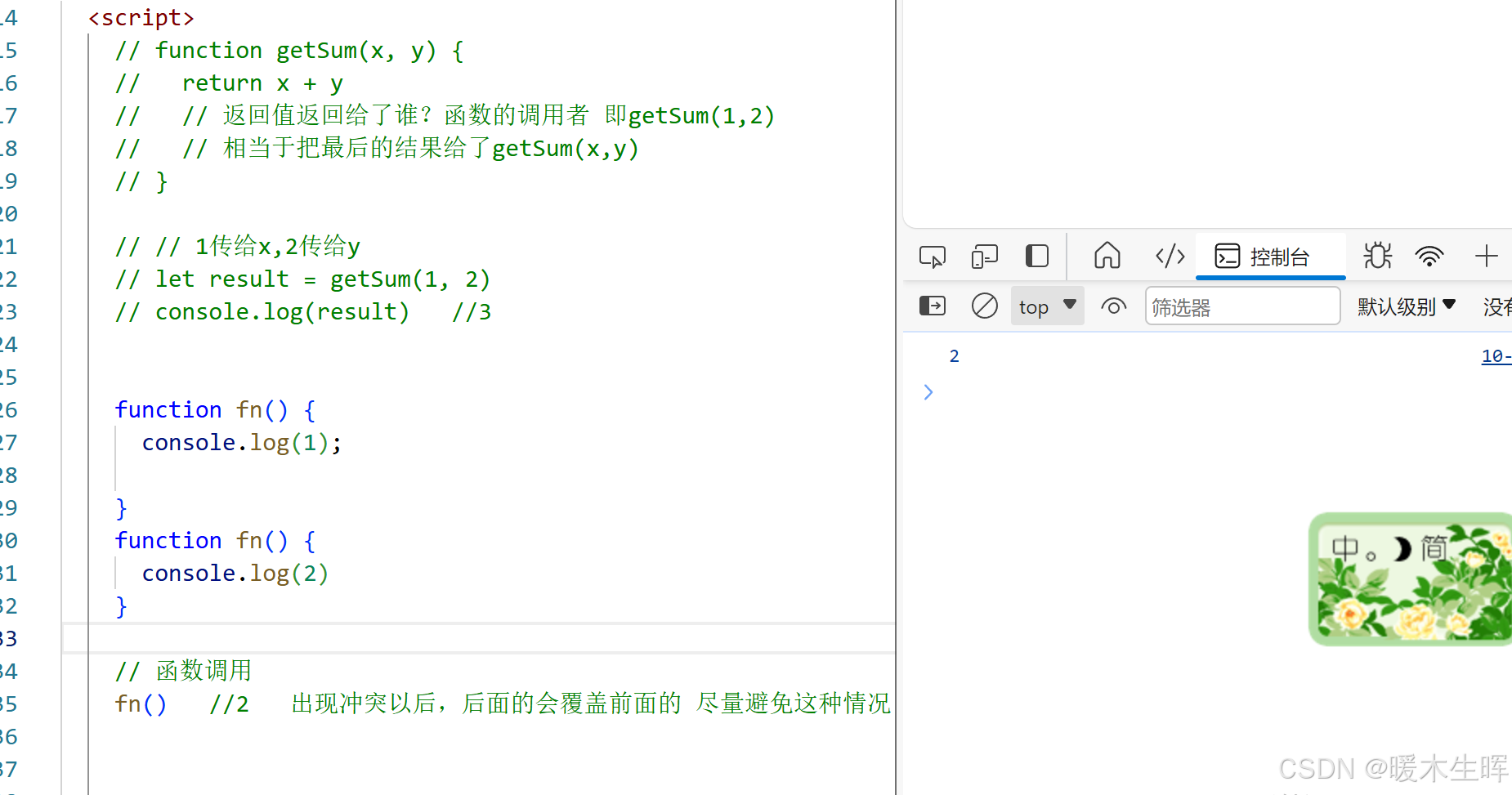 释义:return 20相当于就是把20这个值赋给fn()这个函数,所以我们在输出打印的时候,要打印console.log(fn()) //20,这样直接写这个函数太繁琐了,我们可以把这个函数给一个变量,然后直接打印这个变量。