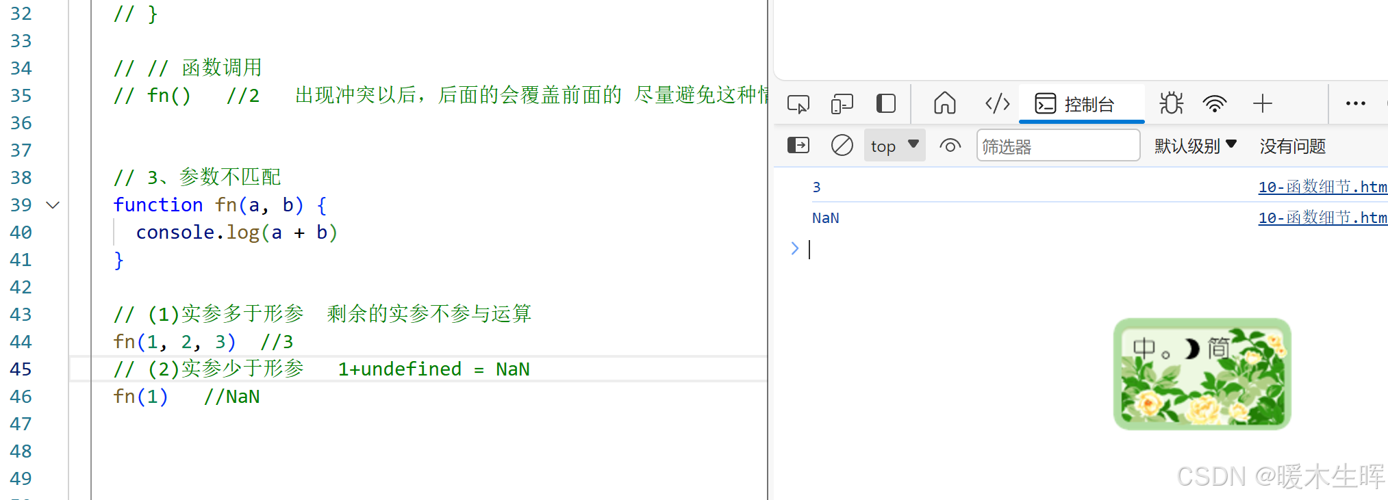 实参少于形参 少的那个值为undefined,最后结果为NaN