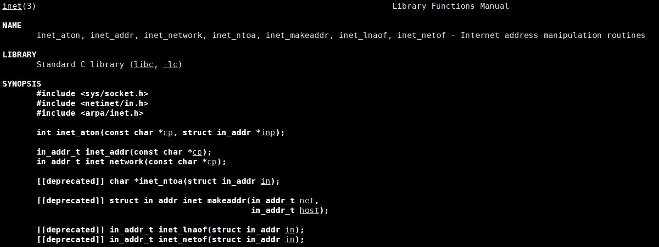 inet_addr | 将点分十进制 IP 字符串转换为网络字节序整数(in_addr_t类型) | inet_pton | 缺陷:无法区分"255.255.255.255"和错误,已不推荐 |