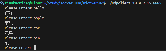 {if(argc!=2){std::cerr << "Usage: " << argv[0] << " port" << std::endl;return 1;}uint16_t port = std::stoi(argv[1]);//Enable_Console_Log_Strategy();Dict dict;dict.LoadDict();std::unique_ptr<UDPServer> usvr = std::make_unique<UDPServer>(port,[&dict](const std::string& word,InetAddr& cli)->std::string{return dict.Translate(word,cli);});usvr->Init();usvr->Start();return 0;