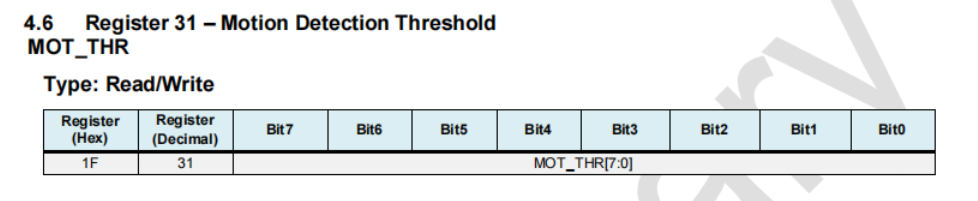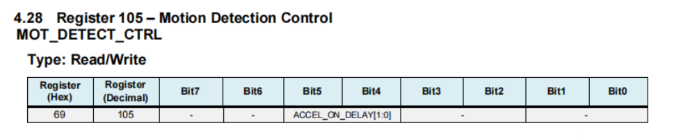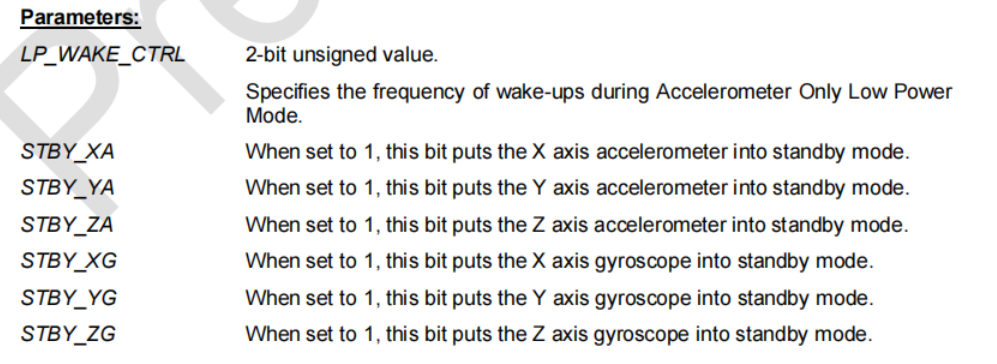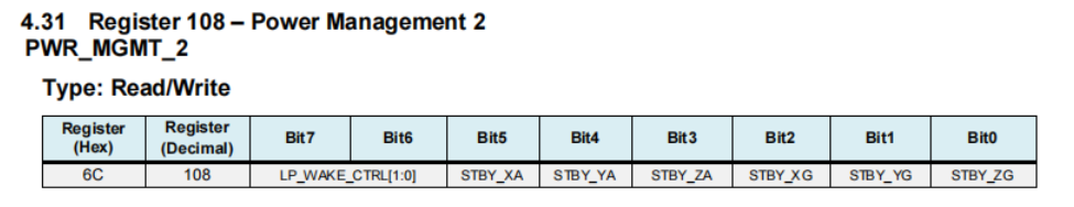 该寄存器功能:设置陀螺仪或加速度计的XYZ轴中的任意轴为待机模式,设置低功耗模式下的加速度计唤醒频率