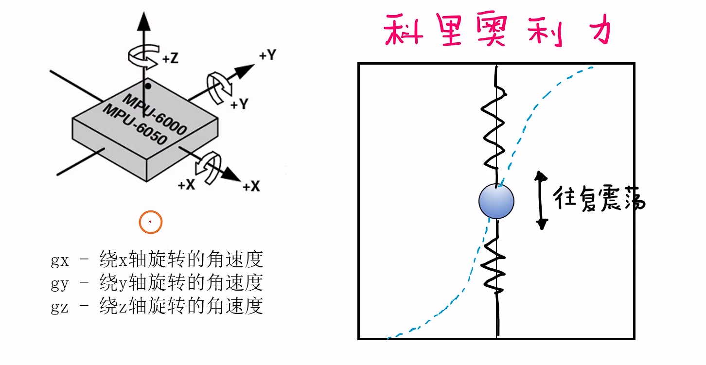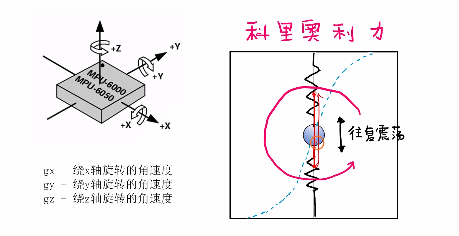 当陀螺仪按红色箭头旋转的时候,会有沿着蓝色虚线方向作用的科里奥利力,也就是陀螺仪采集的数据