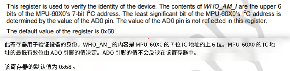 可以查找产品手册,查找从机地址,也可以根据第34节关于寄存器177的介绍得知从机地址默认为0x68,根据电路图上AD0引脚的值,确定从机地址的最后一位,因此当AD0为0时从机地址为0x68,当AD0为1时,从机地址为0x69。
