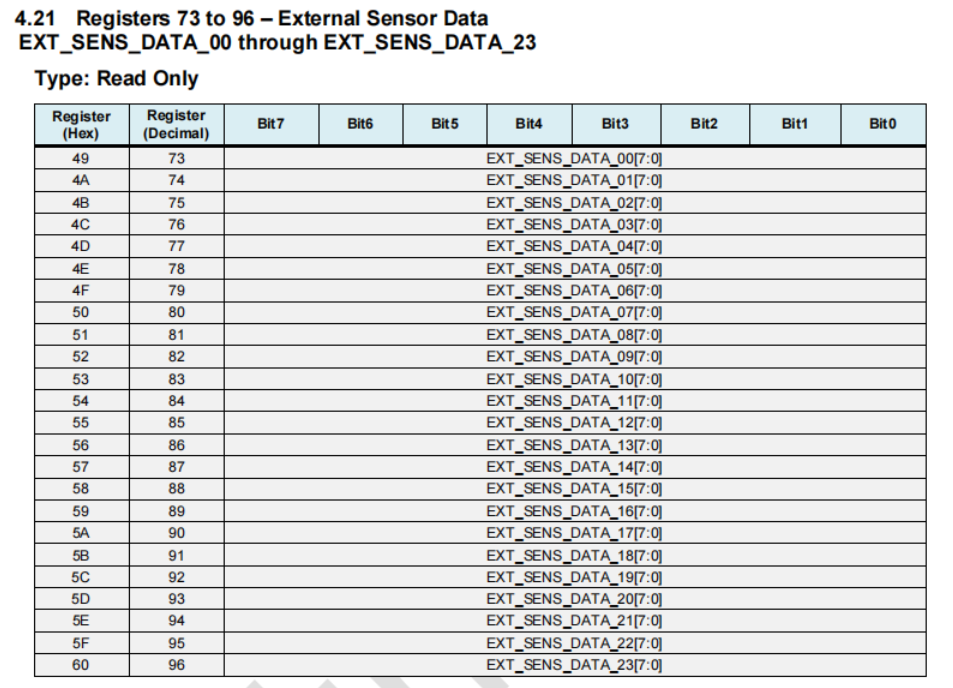 共24个寄存器,可以用存储,MPU6050作为主机时,从四个从机获取到的陀螺仪/加速度计数据。