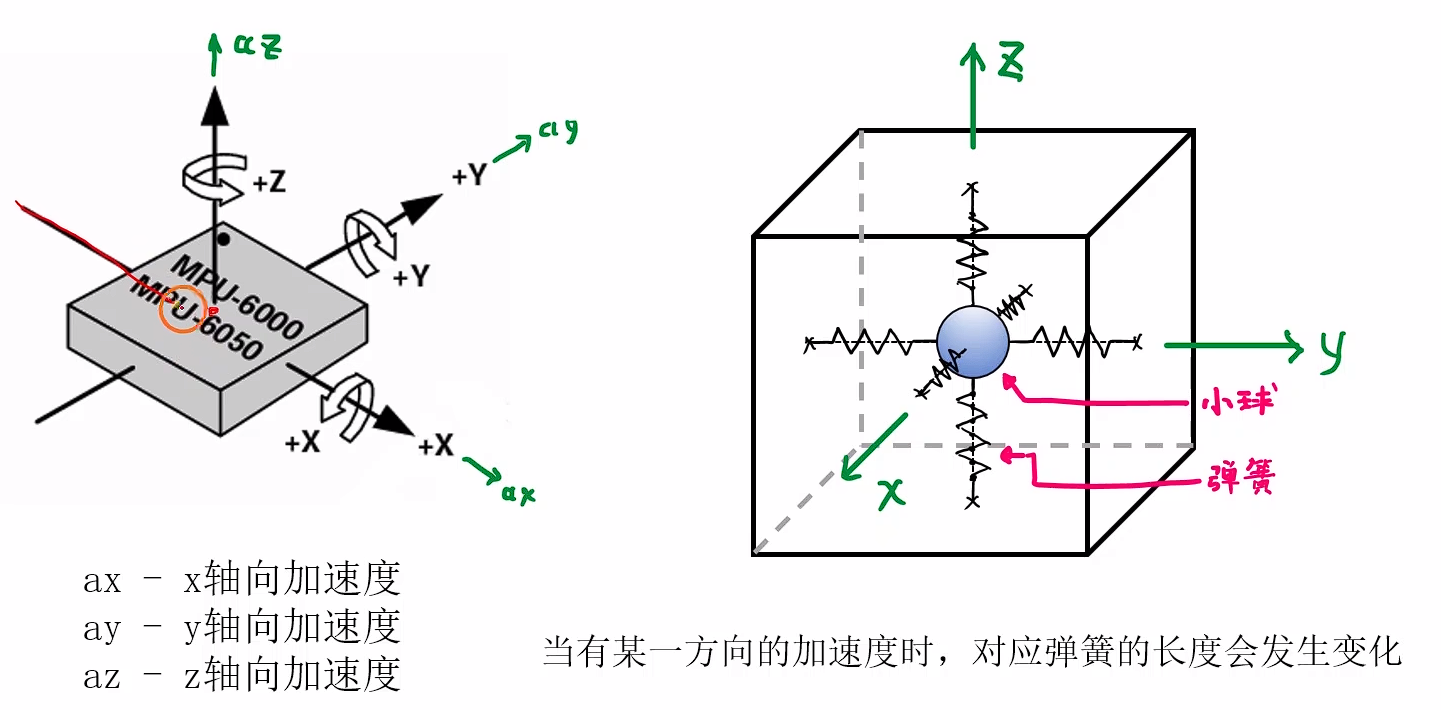 下图中左侧在XYZ轴上的是加速度力的作用力示意图,右侧是加速度计内部的一个模拟示意图