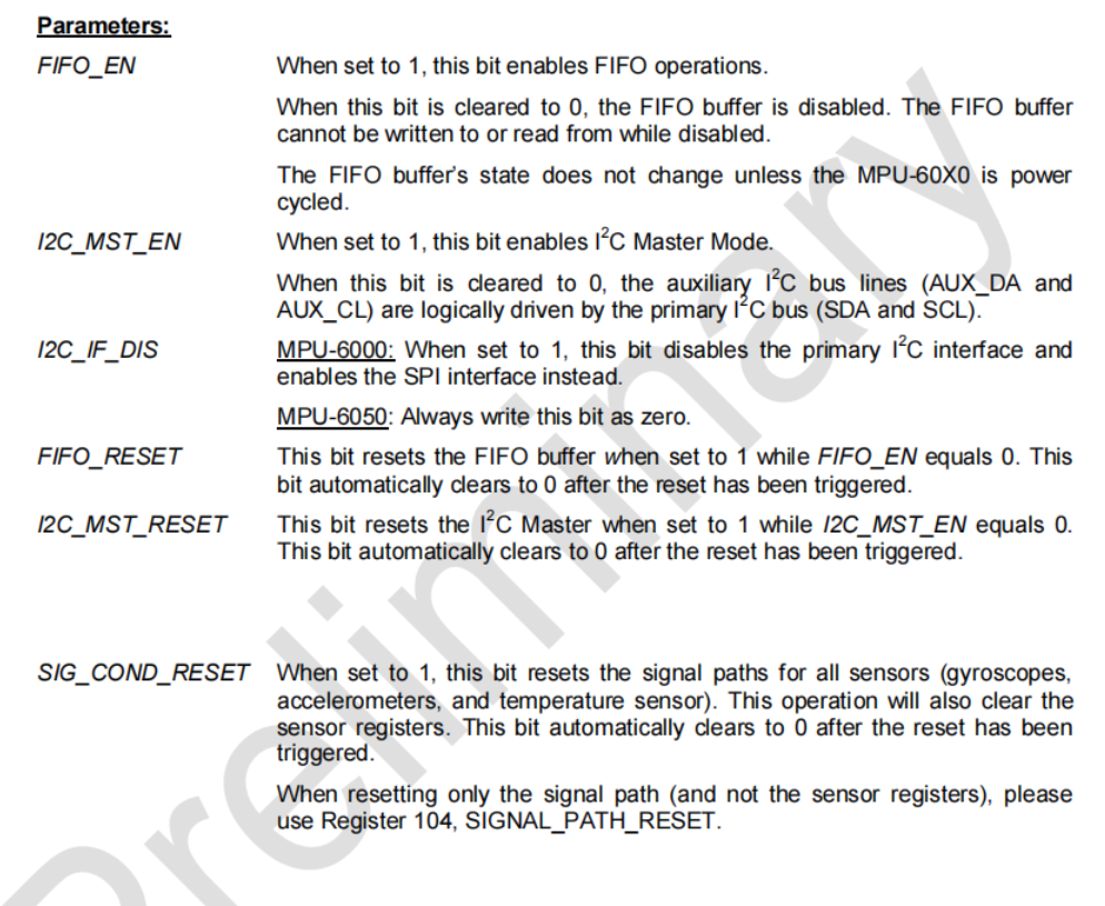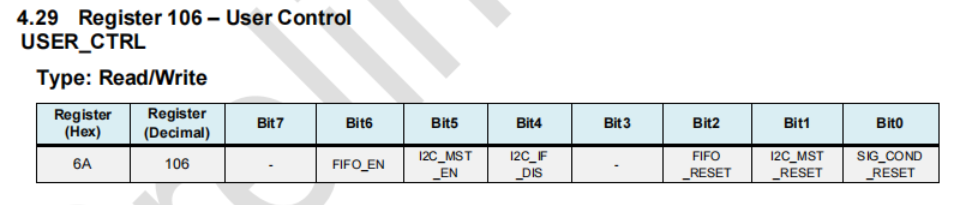 该寄存器的主要功能,使能缓冲区,设置是否使用SDA和SCL主导通讯,设置MPU6000是使用IIC协议还是使用SPI协议,MPU6050只能使用IIC协议