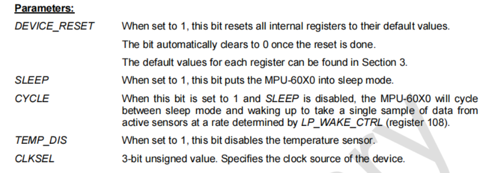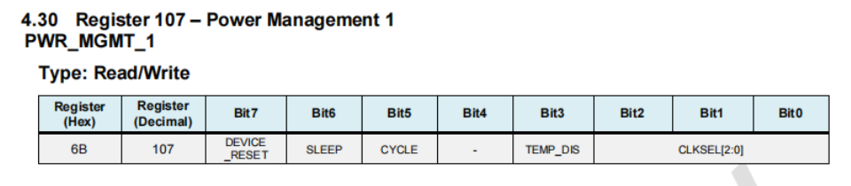 该寄存器的功能:将整个设备复位,进入/退出休眠模式,设置时钟信号源,温度采集屏蔽