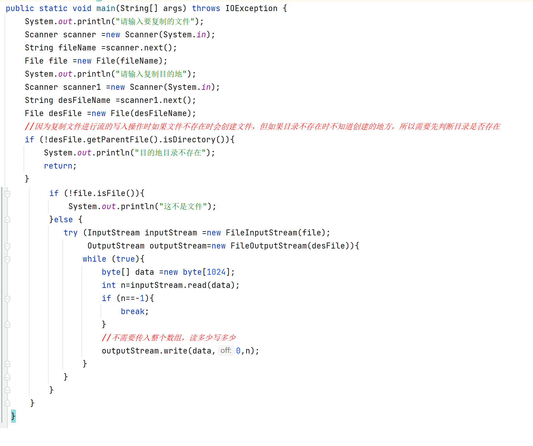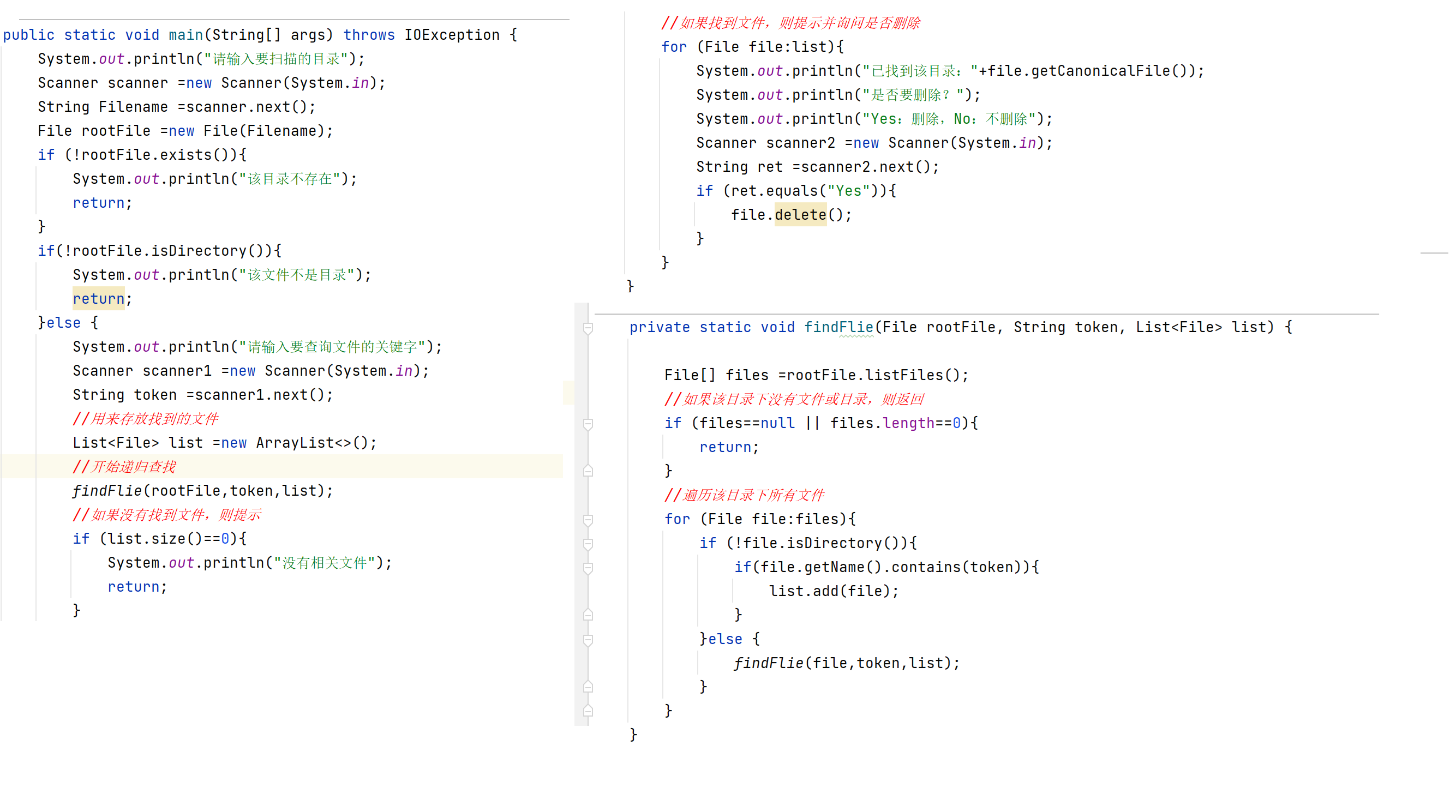 public class Demo3 {public static void main(String[] args) {System.out.println("请输入要查询的目录");Scanner scanner = new Scanner(System.in);String pathRoot = scanner.next();File fileRoot = new File(pathRoot);if (!fileRoot.isDirectory()) {System.out.println("输入的路径不是目录");} else {System.out.println("请输入要查找的关键字");String keyword = scanner.next();scanDir(fileRoot, keyword);}}private static void scanDir(File fileRoot, String keyword) {File[] files = fileRoot.listFiles();if (files == null) {return;}//用来存放文件内容StringBuilder st = new StringBuilder();//遍历目录for (File file : files) {if (file.isFile()) {//判断文件名是否包含关键字if (file.getName().contains(keyword)) {System.out.println("文件名包含关键字:"+file.getAbsolutePath());}else {//读取文件内容,判断是否包含关键字try(InputStream inputStream = new FileInputStream(file)) {while (true){byte[] bytes = new byte[1024];int ch = inputStream.read(bytes);if (ch == -1) {break;}st.append(new String(bytes));}} catch (IOException e) {throw new RuntimeException(e);}if(st.indexOf(keyword)!=-1){System.out.println("文件内容包含关键字:"+file.getAbsolutePath());}}} else {scanDir(file, keyword);}}}