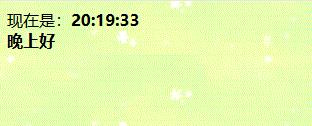 function ShowTime(){var strgreet = "";var datetime = new Date(); //获取当前时间var hour = datetime.getHours(); //获取小时var minu = datetime.getMinutes(); //获取分钟var seco = datetime.getSeconds(); //获取秒钟strtime =hour+":"+minu+":"+seco+" "; //组合当前时间if(hour >= 0 && hour < 8){ //判断是否为早上strgreet ="早上好";}if(hour >= 8 && hour < 11){ //判断是否为上午strgreet ="上午好";}if(hour >= 11 && hour < 13){ //判断是否为中午strgreet = "中午好";}if(hour >= 13 && hour < 17){ //判断是否为下午strgreet ="下午好";}if(hour >= 17 && hour < 24){ //判断是否为晚上strgreet ="晚上好";}window.setTimeout("ShowTime()",1000); //每隔1秒重新获取一次时间document.getElementById("time").innerHTML="现在是:<b>"+strtime+"</b>";document.getElementById("greet").innerHTML="<b>"+strgreet+"</b>";