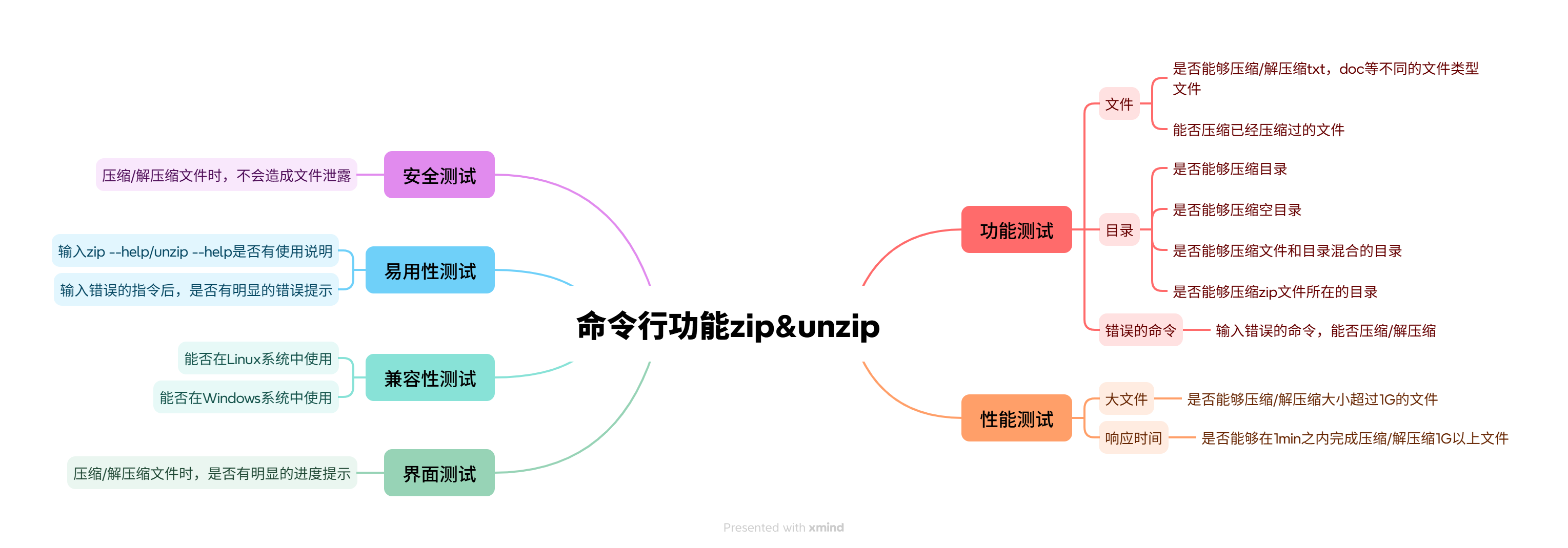 命令行程序zip和unzip能够实现对文件的压缩和解压缩,针对这个功能设计测试用例;