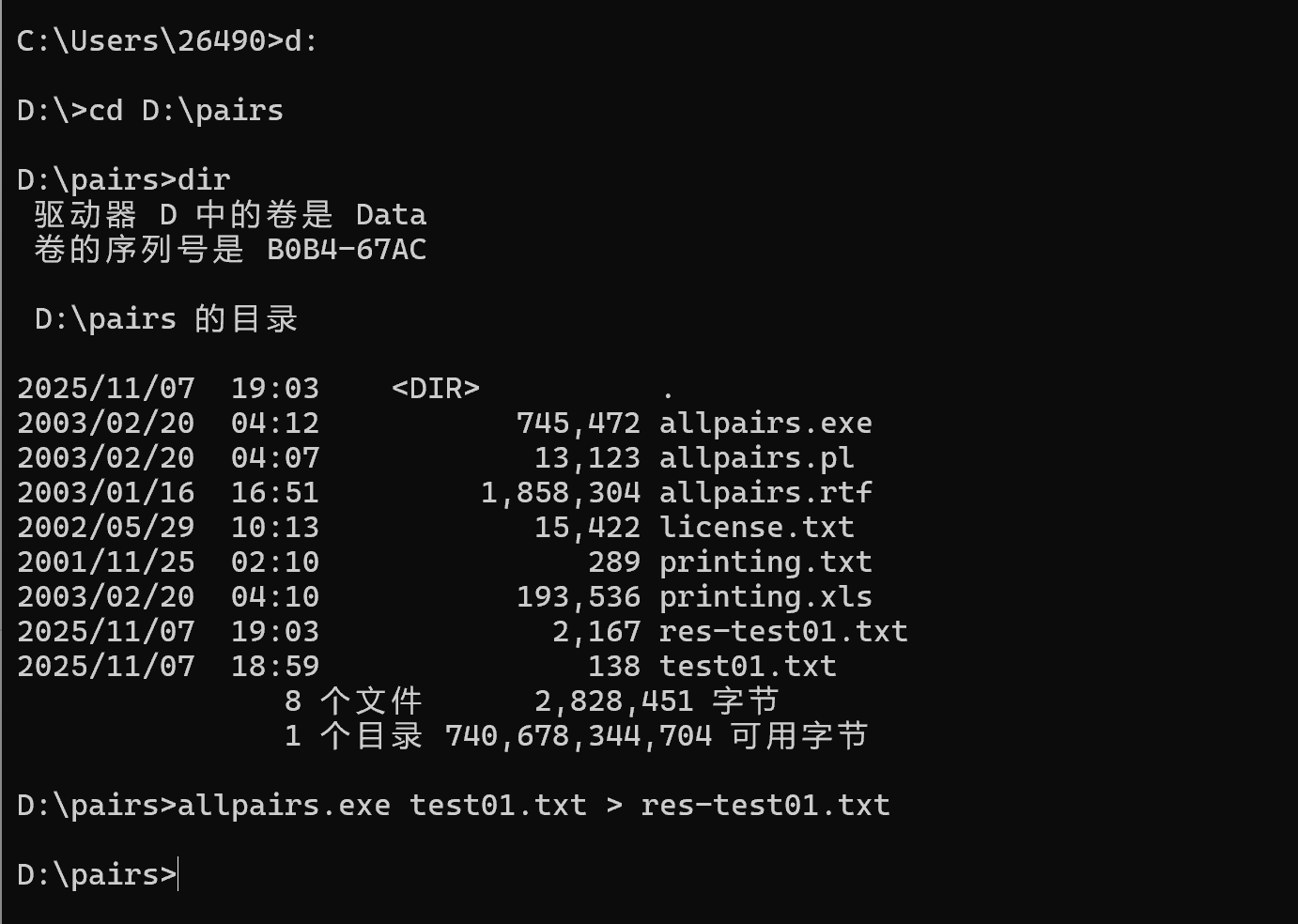 3. 使用命令行,转换test01.txt为正交表,将转换的正交表保存到res-test01.txt;