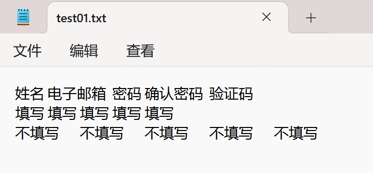 2. 创建要转换的文件test01.txt,将表中的数据复制到txt中;
