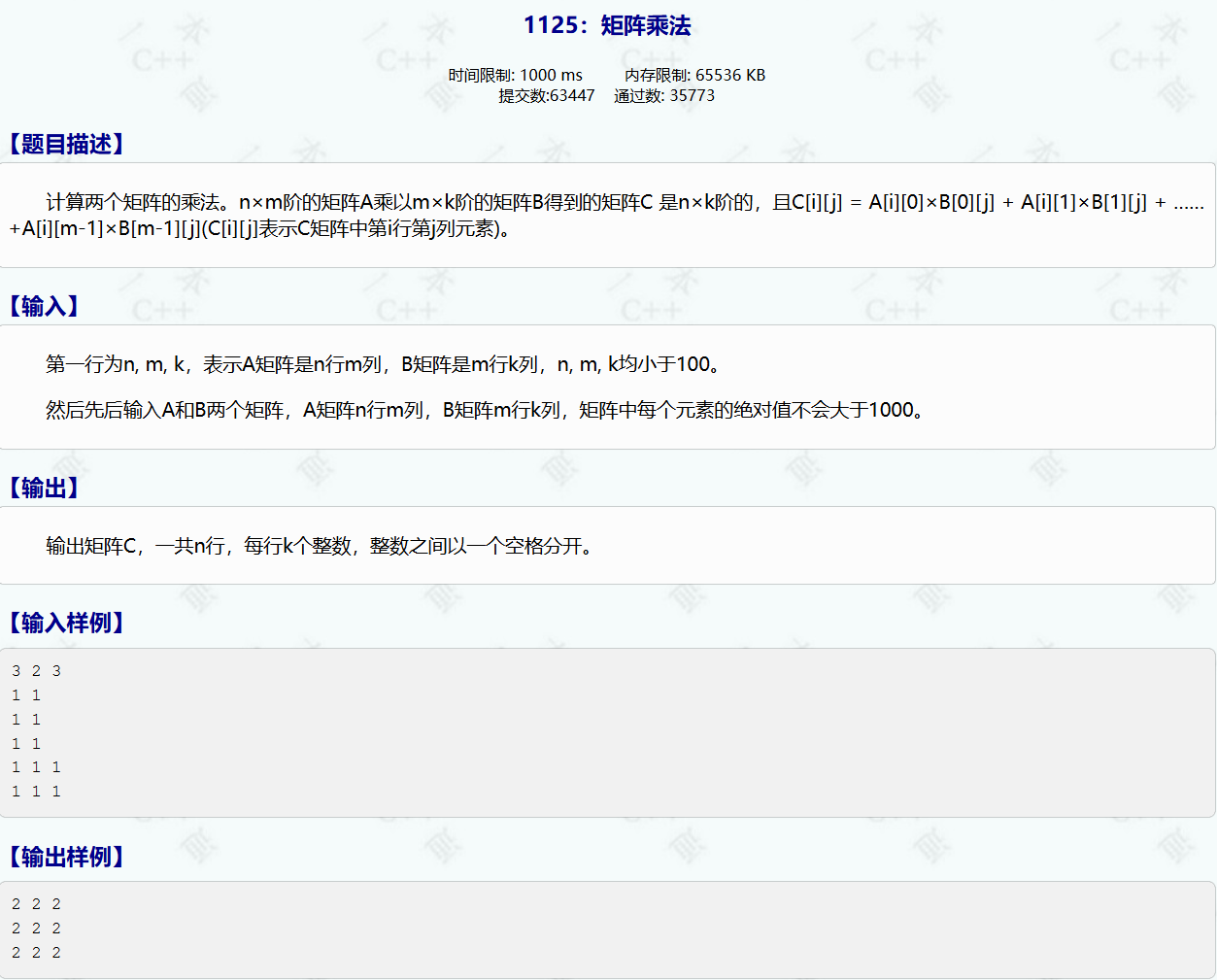 {int n = 0, m = 0, k = 0;cin >> n >> m >> k;//初始化矩阵Aint** arr1 = new int* [n];for (int i = 0; i < n; i++){arr1[i] = new int[m];}//初始化矩阵Bint** arr2 = new int* [m];for (int i = 0; i < m; i++){arr2[i] = new int[k];}//读入矩阵A的数据for (int i = 0; i < n; i++){for (int j = 0; j < m; j++){cin >> arr1[i][j];}}//读入矩阵B的数据for (int i = 0; i < m; i++){for (int j = 0; j < k; j++){cin >> arr2[i][j];}}//定义一个变量,存储矩阵C[i][j]的值,计算结果后直接打印。int num = 0;for (int i = 0; i < n; i++){for (int j = 0; j < k; j++){num = 0;//这个循环求的是C[i][j]位置的值。for (int a = 0; a < m; a++){num += arr1[i][a] * arr2[a][j];}cout << num << " ";}cout << endl;}
