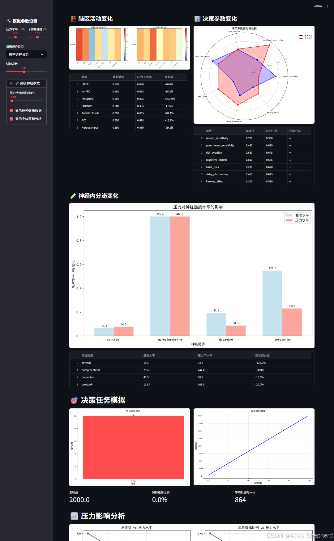 self.brain_regions = {'dlPFC': 0.85, # 背外侧前额叶 - 执行控制(压力下被抑制)'vmPFC': 0.75, # 腹内侧前额叶 - 价值评估'Amygdala': 0.25, # 杏仁核 - 威胁检测(压力下激活)# ... 其他脑区