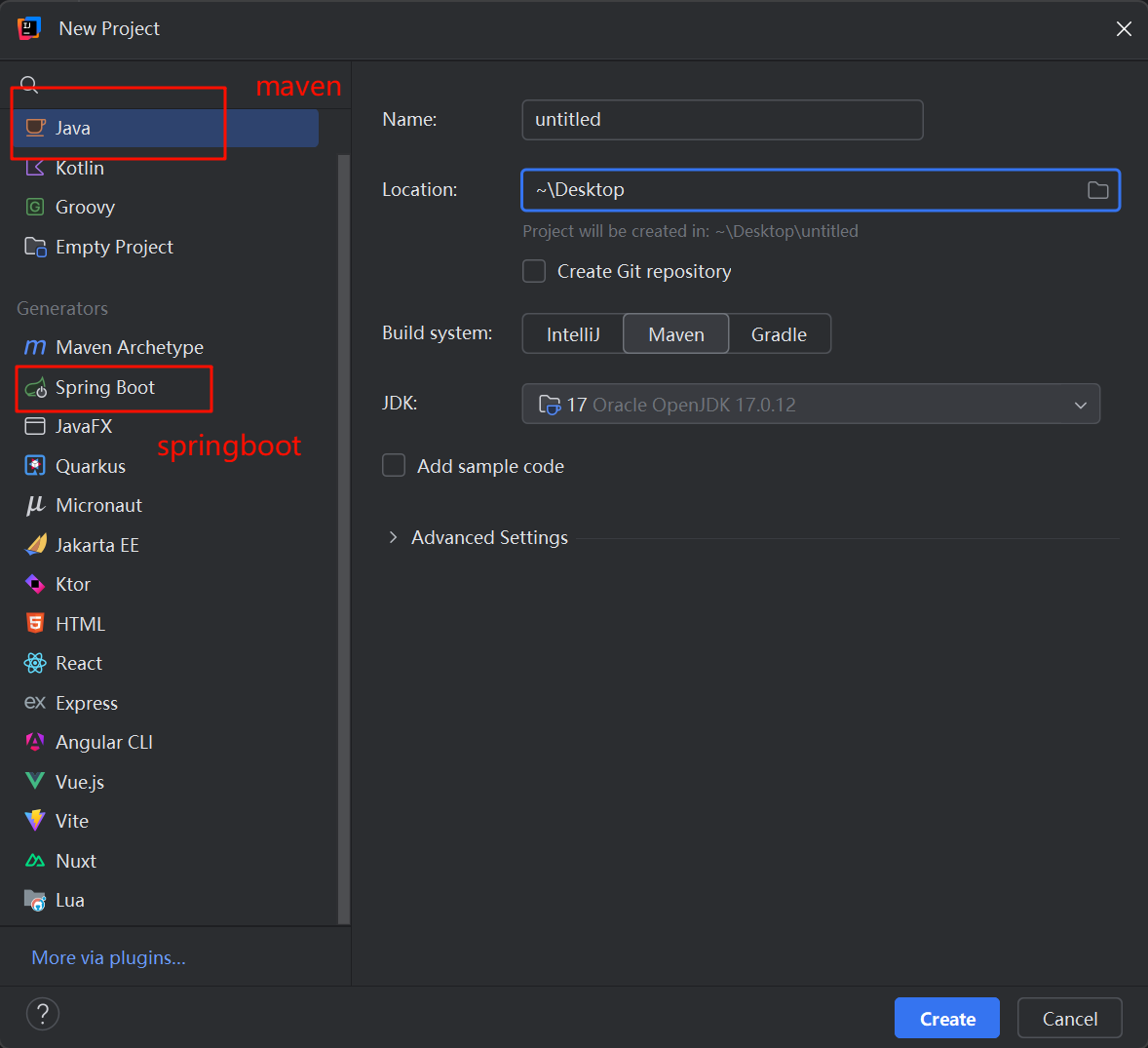 - 若想从零开始手动管理依赖和配置,选「Maven + Java」,自由度更高但工作量也更大