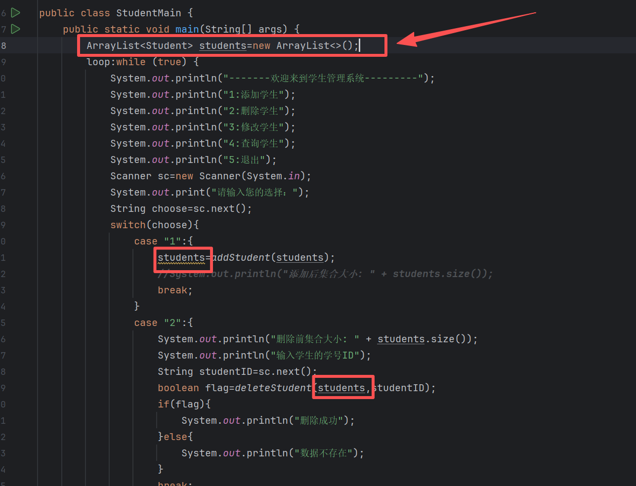 import java.util.Scanner;public class StudentMain {public static void main(String[] args) {ArrayList<Student> students=new ArrayList<>();loop:while (true) {System.out.println("-------欢迎来到学生管理系统---------");System.out.println("1:添加学生");System.out.println("2:删除学生");System.out.println("3:修改学生");System.out.println("4:查询学生");System.out.println("5:退出");Scanner sc=new Scanner(System.in);System.out.print("请输入您的选择:");String choose=sc.next();switch(choose){case "1":{students=addStudent(students);//System.out.println("添加后集合大小: " + students.size());break;}case "2":{System.out.println("删除前集合大小: " + students.size());System.out.println("输入学生的学号ID");String studentID=sc.next();boolean flag=deleteStudent(students,studentID);if(flag){System.out.println("删除成功");}else{System.out.println("数据不存在");}break;}case "3":{System.out.println("输入学生的学号ID");String studentID=sc.next();updateStudent(students,studentID);break;}case "4":{//System.out.println("查询前集合大小: " + students.size());System.out.println("输入学生的学号ID");String studentID=sc.next();String result=selectStudent(students,studentID);System.out.println(result);break;}case "5":{System.out.println("退出");break loop;}default:{System.out.println("不存在此选项");break;}}}}//添加学生//id唯一public static ArrayList<Student> addStudent(ArrayList<Student> list){//利用集合来存储学生的信息//ArrayList<Student> students=new ArrayList<Student>();Scanner sc=new Scanner(System.in);while(true){System.out.println("请输入学生的ID");String id=sc.next();System.out.println("请输入学生的姓名");String name=sc.next();System.out.println("请输入学生的年龄");int age=sc.nextInt();System.out.println("请输入学生的家庭住址");String address=sc.next();//添加后需要对新增的ID判断,是否存在当前集合中if(!list.isEmpty()){for(int i=0;i<list.size();i++){if(list.get(i).getId().equals(id)){System.out.println("学生ID"+list.get(i).getId()+"已经存在");return list;}}}list.add(new Student(id,name,age,address));System.out.println("添加成功");return list;}}//删除学生public static boolean deleteStudent(ArrayList<Student> list,String id){//String flag="";if(!list.isEmpty()){for(int i=0;i<list.size();i++){if(list.get(i).getId().equals(id)){list.remove(i);return true;}}}return false;}//修改学生public static boolean updateStudent(ArrayList<Student> list,String id){Scanner sc=new Scanner(System.in);for(int i=0;i<list.size();i++){if(list.get(i).getId().equals(id)){System.out.println("输入修改学生的姓名");String name=sc.next();System.out.println("输入修改学生的年纪");int age=sc.nextInt();System.out.println("输入修改学习的家庭住址");String address=sc.next();list.get(i).setName(name);list.get(i).setAge(age);list.get(i).setAddress(address);return true;}}return false;}//查询学生public static String selectStudent(ArrayList<Student> list,String id){if(!list.isEmpty()){for(int i=0;i<list.size();i++){if(list.get(i).getId().equals(id)){String name=list.get(i).getName();String address=list.get(i).getAddress();int age=list.get(i).getAge();return name+","+age+","+address;}}}return "无当前学生信息,请添加后重新查询";}}这个练习中,比较容易出错的一点:整个增删改查的集合都是同一个集合,那么定义集合对象的是就不能放在while循环里面,否则每次都是产生一个新的集合对象