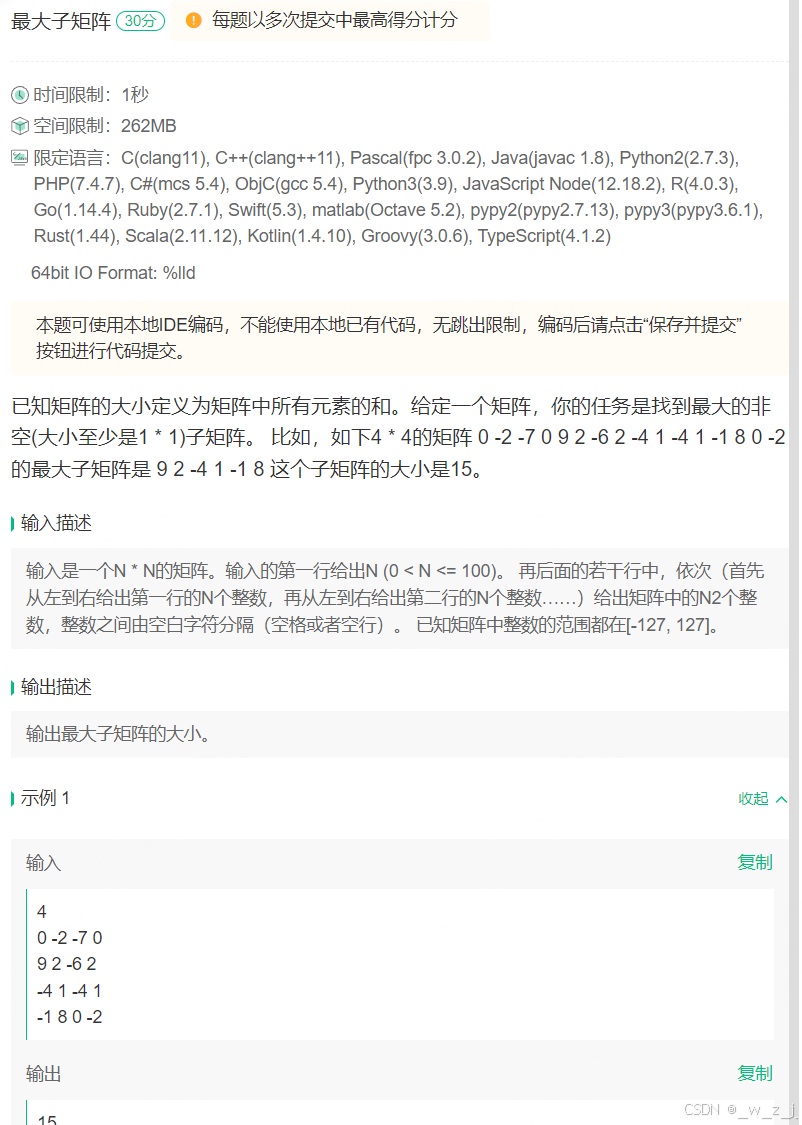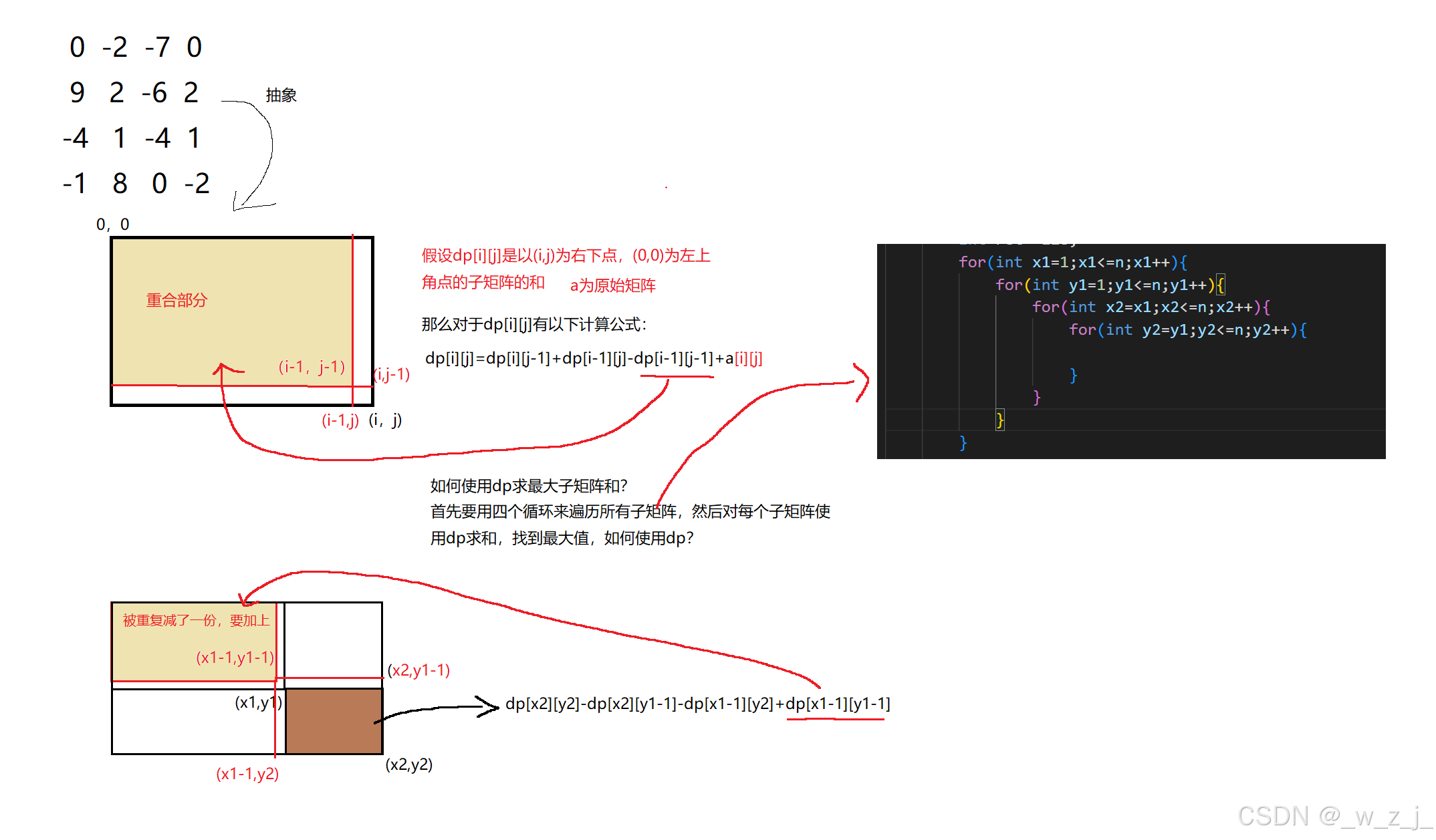 这个题需要用到和动态规划----过河卒-CSDN博客一样的技巧。我们先分析题目,看看对于这样最大子矩阵怎么使用动态规划。