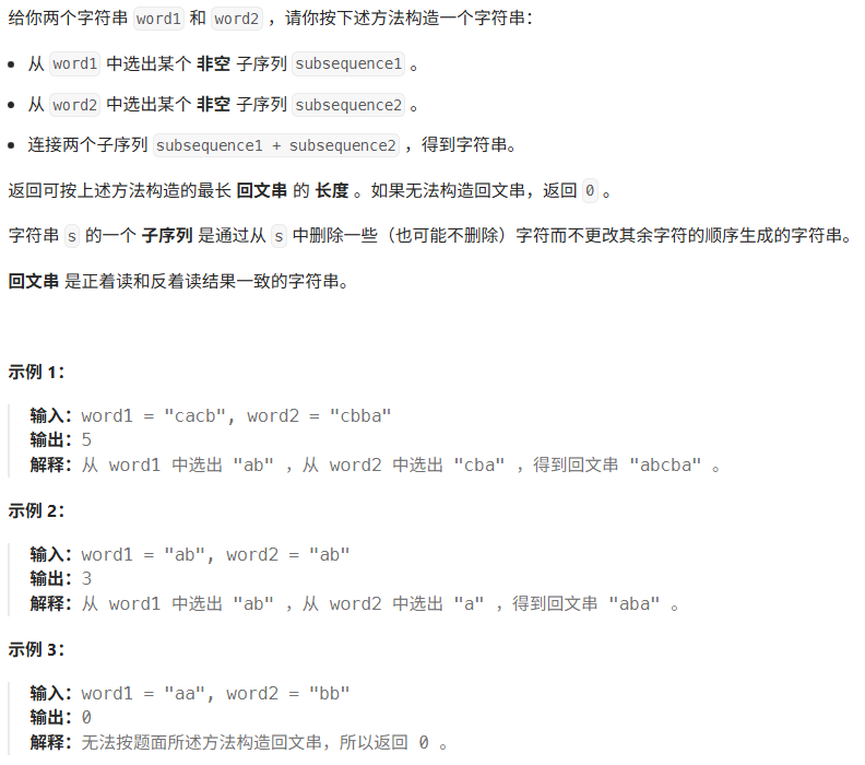 class Solution {public int longestPalindrome(String word1, String word2) {String s=word1+word2;int n=s.length();int[][] dp=new int[n][n];int result=0;for(int i=n-1;i>=0;i--){dp[i][i]=1;for(int j=i+1;j<n;j++){if(s.charAt(i)==s.charAt(j)){dp[i][j]=dp[i+1][j-1]+2;//回文串分别由word1和word2组成那么就更新结果if(i<word1.length()&&j>=word1.length())result=Math.max(result,dp[i][j]);}elsedp[i][j]=Math.max(dp[i+1][j],dp[i][j-1]);}}return result;}