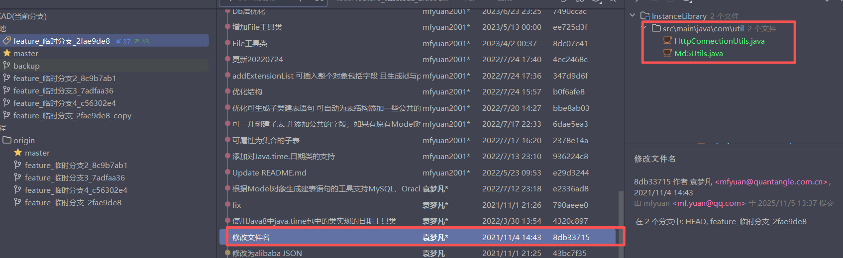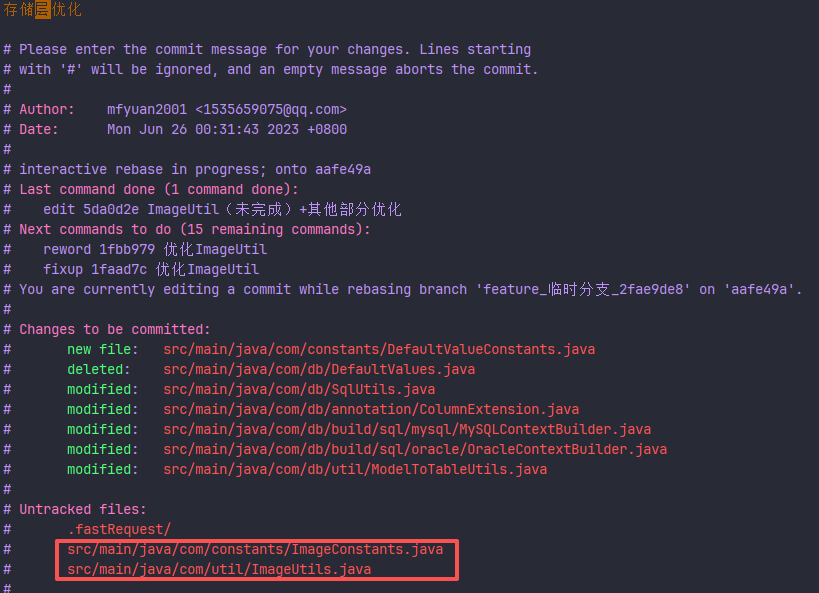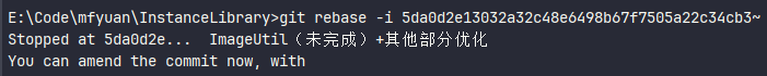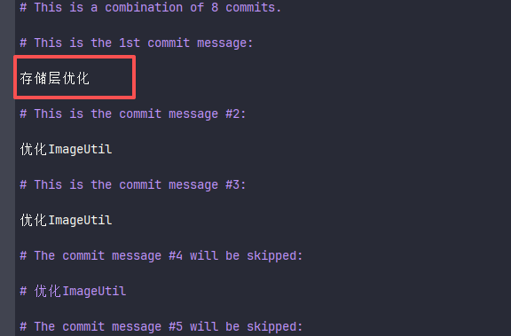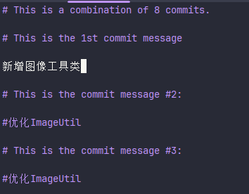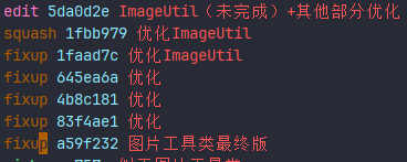 5da0d2e1所以使用edit:wq保存后 为什么都用~~fixup~~呢 ,是因为我想以~~5da0d2e1~~拆分后的~~ImageUtil~~相关的为~~最终提交信息~~的这里遇到了一个**bug **如第二个用**fixup**的话会使用**5da0d2e**的提交信息,而不是**5da0d2e1**拆分后的**ImageUtil**相关的为最终的提交信息,所以这里使用**squash**来修改合并并提交信息
