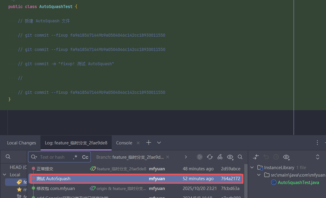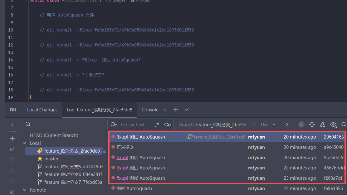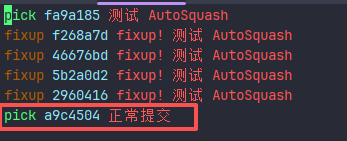 git commit --fixup fa9a185671449b9a0504046c142cc18930011550git commit --fixup fa9a185671449b9a0504046c142cc18930011550git commit -m "fixup! 修改包 com.mfyuan"git commit -m "正常提交"git commit --fixup fa9a185671449b9a0504046c142cc18930011550