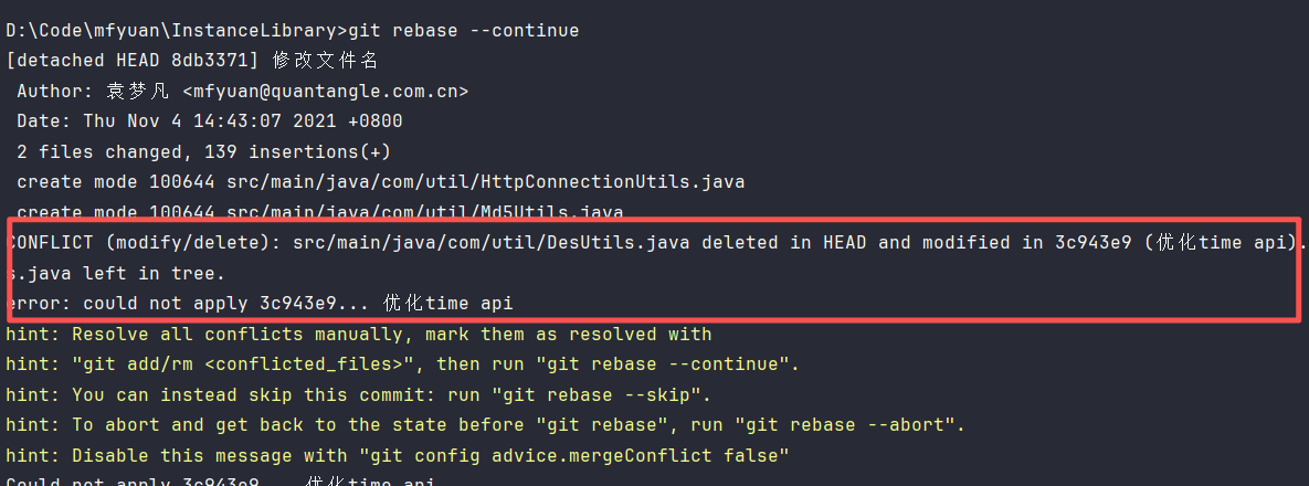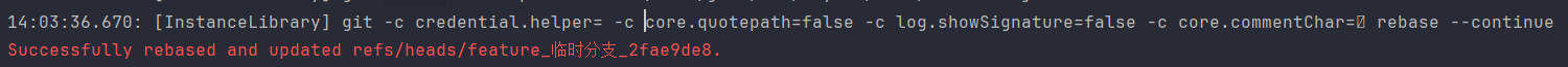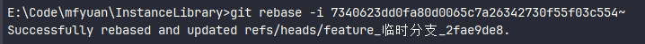 git rebase --continue,因为后面没有冲突及暂停修改的操作了,只有一个合并提交信息的操作,我们修改成最终我们想要的提交信息即可 再通过:wq保存