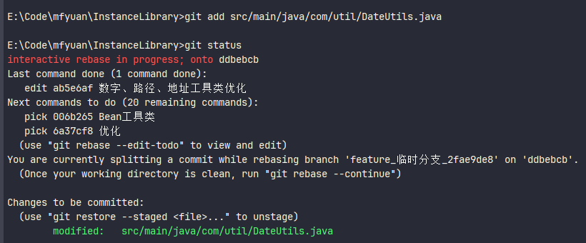 git rebase --continue结束这一次的变基 可以看到这里已经拆分好了,并且生成了新的commit_hash,但是要注意这里的时间并不是原来的而是新的。