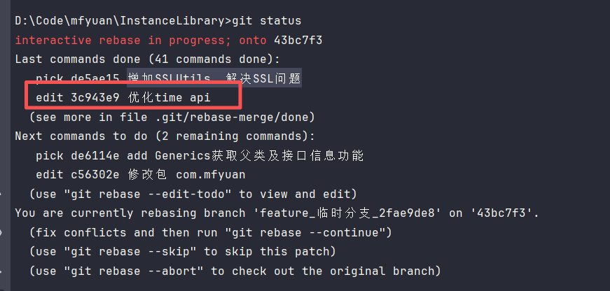 git rebase --continue标识当前标记为edit的修改已经修改完成,并继续执行rebase - 执行上面这个命令后会进入到这个页面让我们修改提交信息,如果不想修改的化直接