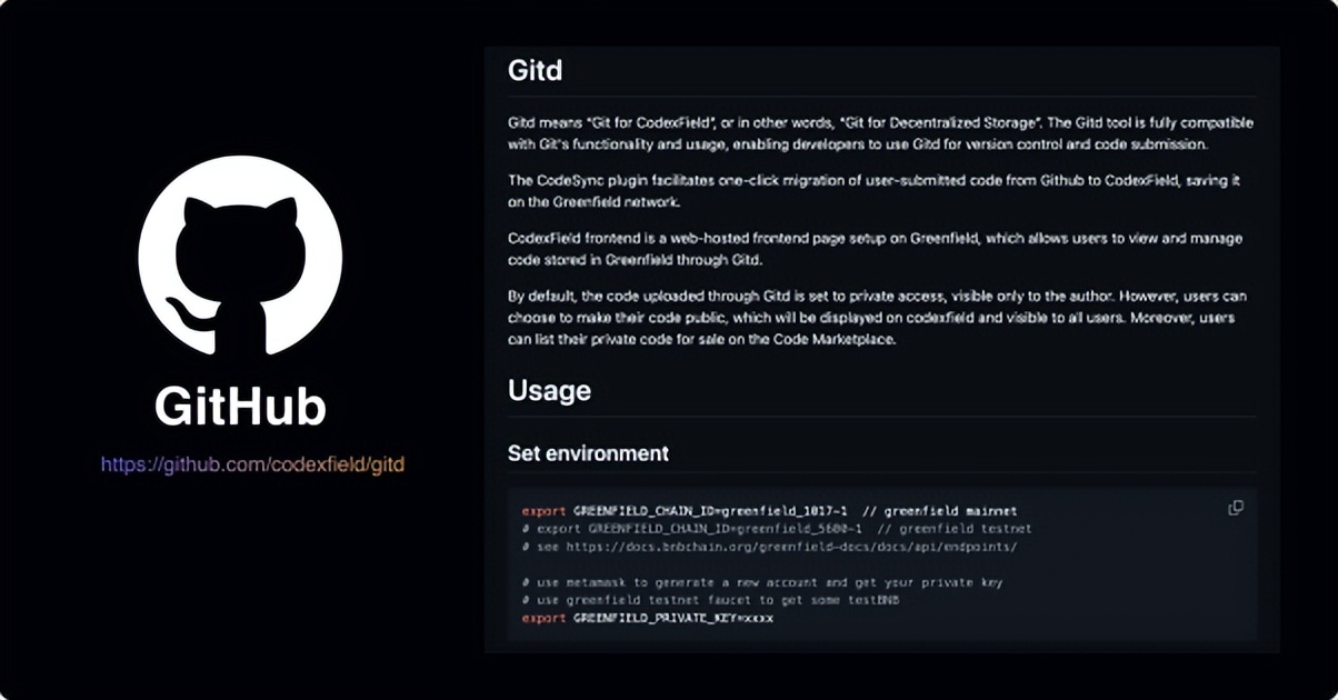 Gitd(“Git for CodexField”)是 CodexField 生态的底层存储与版本控制基础模块,也可以理解为“去中心化存储的 Git”。它在功能和使用体验上与传统 Git 完全兼容,开发者可以直接沿用熟悉的 Git 提交流程、分支管理与协作机制。不同的是,Gitd 将代码与内容版本存储在去中心化网络 Greenfield 上,从而确保开发成果在链上具有防篡改性、可追溯性与真实归属。