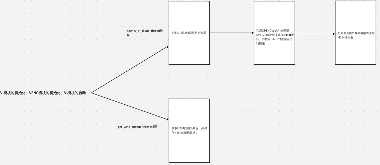 {int ret;VI_CHN_ATTR_S vi_chn_attr;vi_chn_attr.pcVideoNode = CAMERA_PATH; // Pathvi_chn_attr.u32Width = 1920; // Widthvi_chn_attr.u32Height = 1080; // Heightvi_chn_attr.enPixFmt = IMAGE_TYPE_NV12; // ImageTypevi_chn_attr.enBufType = VI_CHN_BUF_TYPE_MMAP; // BufTypevi_chn_attr.u32BufCnt = 3; // Cntvi_chn_attr.enWorkMode = VI_WORK_MODE_NORMAL; // Moderet = RK_MPI_VI_SetChnAttr(CAMERA_ID, CAMERA_CHN, &vi_chn_attr);if (ret){printf("Vi Set Attr Failed.....\n");return 0;}else{printf("Vi Set Attr Success.....\n");}ret = RK_MPI_VI_EnableChn(CAMERA_ID, CAMERA_CHN);if (ret){printf("Vi Enable Attr Failed.....\n");return 0;}else{printf("Vi Enable Attr Success.....\n");}VENC_CHN_ATTR_S venc_chn_attr;memset(&venc_chn_attr, 0, sizeof(VENC_CHN_ATTR_S));venc_chn_attr.stVencAttr.u32PicWidth = 1920;venc_chn_attr.stVencAttr.u32PicHeight = 1080;venc_chn_attr.stVencAttr.u32VirWidth = 1920;venc_chn_attr.stVencAttr.u32VirHeight = 1080;venc_chn_attr.stVencAttr.imageType = IMAGE_TYPE_NV12;venc_chn_attr.stVencAttr.enType = RK_CODEC_TYPE_H264;venc_chn_attr.stVencAttr.u32Profile = 66;venc_chn_attr.stRcAttr.enRcMode = VENC_RC_MODE_H264CBR;venc_chn_attr.stRcAttr.stH264Cbr.u32Gop = 25;venc_chn_attr.stRcAttr.stH264Cbr.u32BitRate = 1920 * 1080 * 3;venc_chn_attr.stRcAttr.stH264Cbr.fr32DstFrameRateDen = 1;venc_chn_attr.stRcAttr.stH264Cbr.fr32DstFrameRateNum = 25;venc_chn_attr.stRcAttr.stH264Cbr.u32SrcFrameRateDen = 1;venc_chn_attr.stRcAttr.stH264Cbr.u32SrcFrameRateNum = 25;ret = RK_MPI_VENC_CreateChn(VENC_CHN, &venc_chn_attr);if (ret){printf("ERROR: Create venc failed!\n");exit(0);}ret = RK_MPI_VI_StartStream(CAMERA_ID, CAMERA_CHN);if (ret){printf("start vi stream failed.....\n");}else{printf("start vi stream success.....\n");}pthread_t pid;pthread_create(&pid, NULL, opencv_vi_dliate_thread, NULL);//膨胀处理线程pthread_create(&pid, NULL, get_venc_stream_thread, NULL);//获取VENC线程while (1){sleep(2);}RK_MPI_VENC_DestroyChn(VENC_CHN);RK_MPI_VI_DisableChn(CAMERA_ID, CAMERA_CHN);return 0;