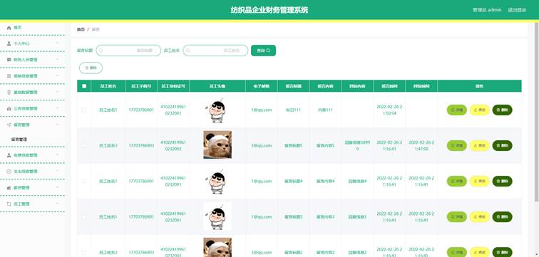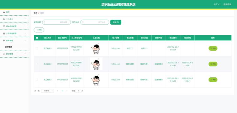 员工进入如图5-8所示的留言管理界面之后,员工点击信息显示栏右侧的详情按钮可完成留言数据的详情查看,员工点击新增按钮即可新增留言信息,查询留言信息的查询条件有留言标题,员工姓名。