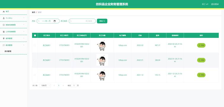 员工进入如图5-9所示的薪资查询界面之后,员工点击信息显示栏右侧的详情按钮可完成薪资数据的详情查看,查询薪资信息的查询条件有月份,员工姓名。