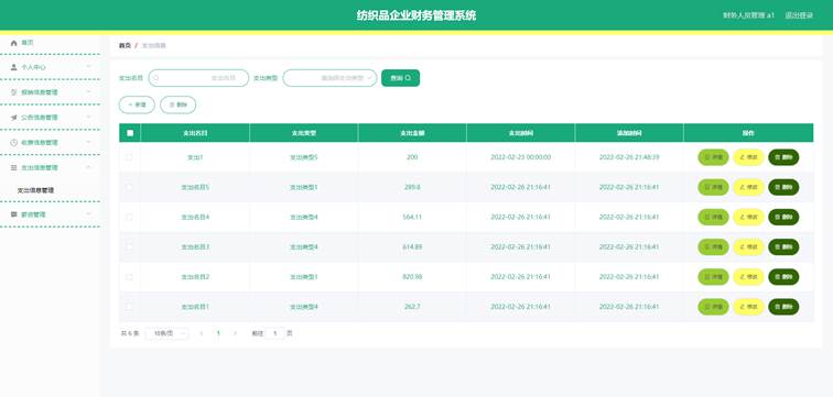 财务人员进入如图5-6所示的支出信息管理界面之后,财务人员点击信息显示栏中最右侧的修改,删除按钮可依次完成含有支出金额,支出类型,支出名目等数据的支出信息的修改,删除。财务人员点击新增按钮即可新增支出信息。