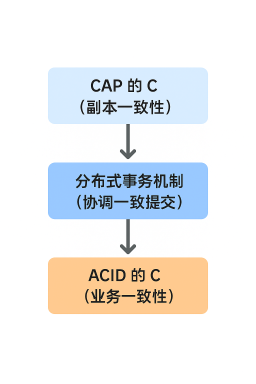 同样的,在分布式系统中,当操作跨多个节点时,保证系统可用性的同时,无法保证操作同时成功。CAP 仍然成立,但“分区”的含义变成了 服务间通信(网络)不可达,而不是 分布式存储副本(网络)不可达,写入语义变成了事务提交成功。