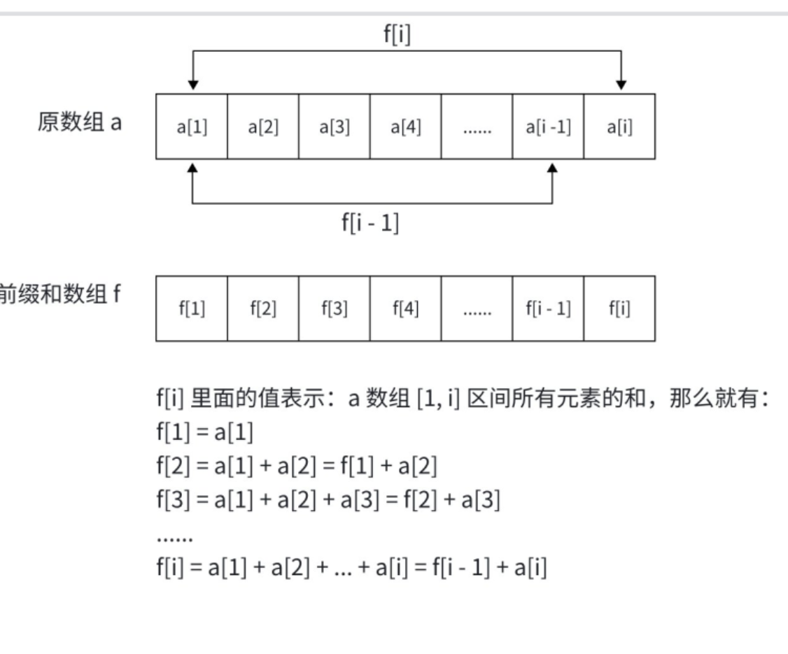 对于一维数组a[1...n](注:本文数组下标均从 1 开始,避免边界处理麻烦),其前缀和数组f[1...n]的定义为:f[i] = a[1] + a[2] + ... + a[i] 即f[i]表示数组a前i个元素的累积和。