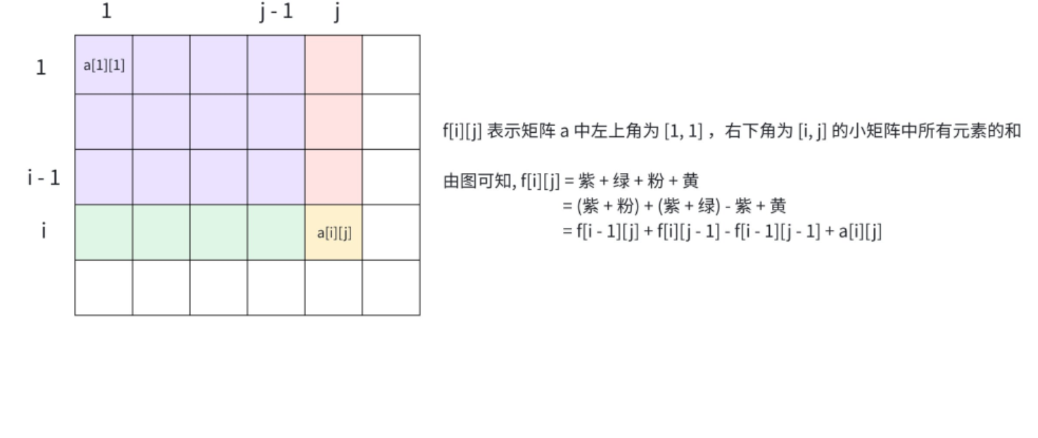 f[i-1][j-1](左上角 (1,1) 到 (i-1,j-1) 的子矩阵)被重复计算了一次,因此需要减去;- 最后加上当前元素