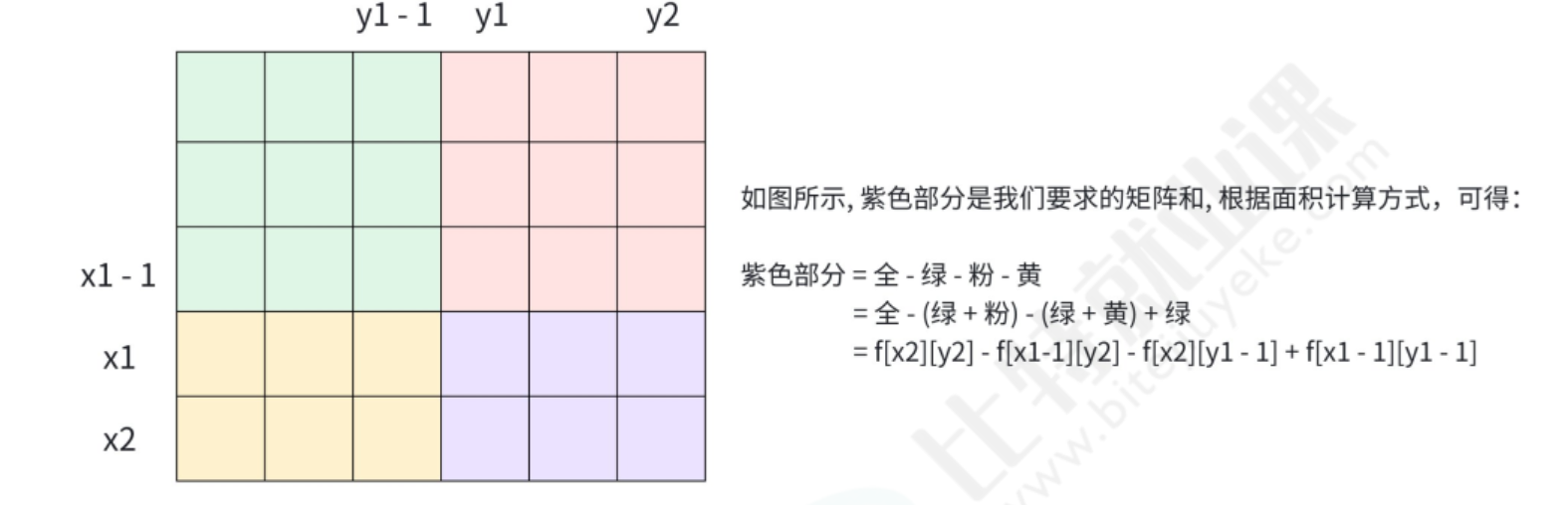 f[x1-1][y1-1]被减去了两次,需要加回一次,得到目标子矩阵的和。